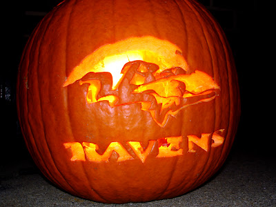This is supposed to be a picture of the Ravens logo, with the word "Ravens" carved underneath. Let me be the first to point out, that its very hard to carve a detailed image into a pumpkin. The medium (i.e. the pumpkin) just isn't made for that, at least not this one. Either way, this was the result of about an hour and half of work by both Jenn and I. Enjoy!