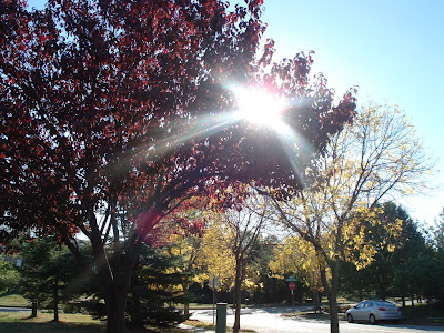 Here is another picture, continuing from the other day about fall leaves. This is another picture taken of the leaves near the house. I kinda like how the sunlight is busting through the trees, but you can still see the deep red and bright yellows of the trees. Enjoy!