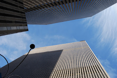 Today's picture is one of some nice 'new' style architecture in New York City. And this is a style of architecture that I am myself defining. I like this picture because it definitely conveys the large size of the buildings. I also like how the sky looks as if its swirling around overhead. Hopefully everyone else will find something they like. Enjoy!