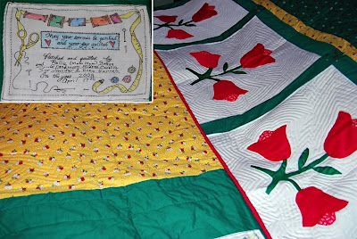 This is a picture of the quilt. The yellow portion is the underside of the quilt. The tulips cover the top of the quilt, and the little inset photo that I placed there is the dedication marker that Mildred made and sewed to the back of the quilt. Enjoy!