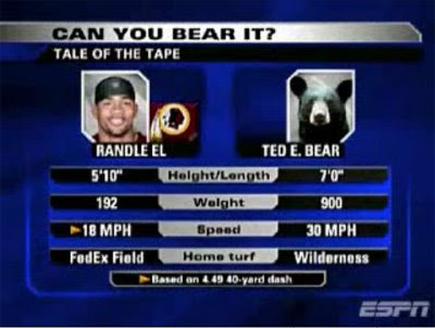 The premise is if a football player were at 1 end zone, a bear at the 50 yd. line, could the player make it 100 yards without getting eaten/mauled by the bear. So this video has a Ph.D guy talk about bears and to represent the football player side, we have Antwan Randle El from the Redskins. Its was quite funny and I encourage you to watch it if you've got a few minutes. But certainly the highlight for me is in the screen capture below. Note the Home Turf location. Enjoy! You can click on the image to see the video on youTube.