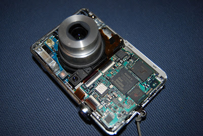 In case you're curious what the insides of your fancy $200 digital camera look like, have no fear, I'm here to share. After a recent trip to the beach, and using Jenn's little digital camera, we came back to notice that the lens was having a few issues opening up. So I took off the cover to take a look and try and blow out the problem. Needless to say, I don't think that I have been 100% successful. The camera does work again now, which is at least a partial success. But at least I got this nice little photo out of it. Enjoy!