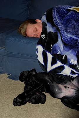 It certainly didn't take long for our new dog, Max, to get the hang of things around the house. In the late evenings Jenn will sometimes fall asleep on the couch, often covered by her Ravens blanket. As you can see here, so will no longer be napping alone on the couch. She seems to have a friend napping with her on the ground. Enjoy!